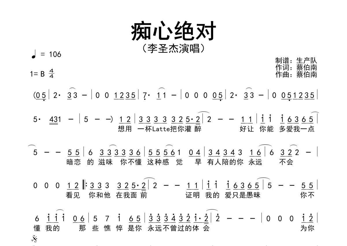曲谱介绍: 李圣杰《痴心绝对》原版简谱,生产队编配出品,共有1张高清图谱,免翻页排版设计。
