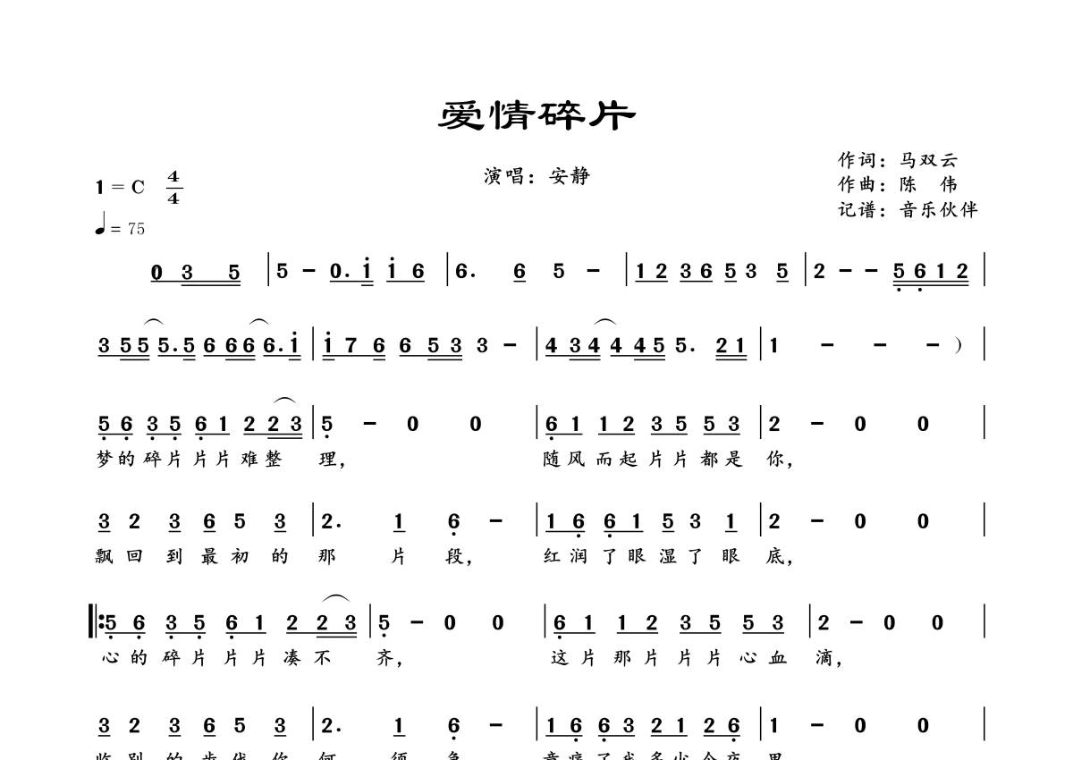 曲谱介绍: 安静《爱情碎片》,音乐伙伴编配出品,共有1张高清图谱,免翻页排版设计。