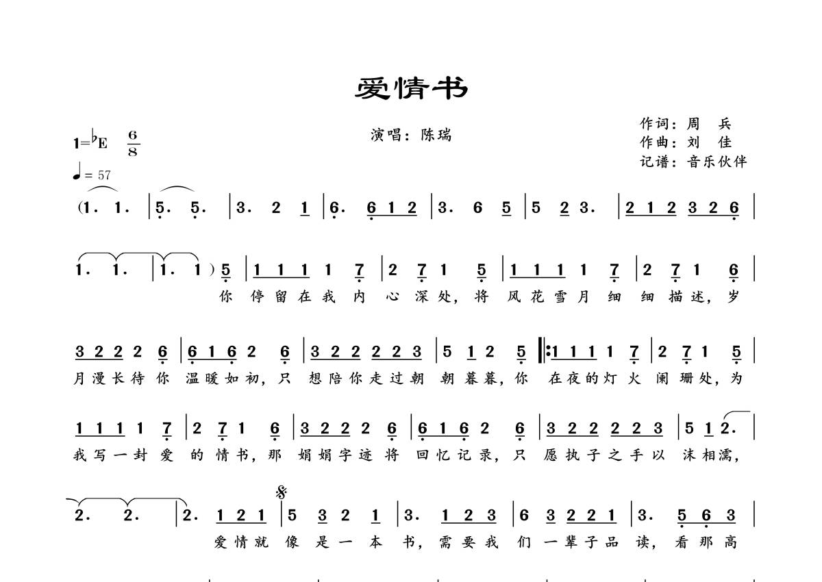 曲谱介绍: 陈瑞《爱情书》,音乐伙伴编配出品,共有1张高清图谱,免翻页排版设计。
