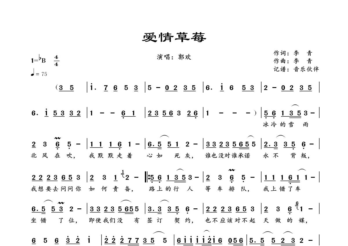 曲谱介绍: 郭欢《爱情草莓》,音乐伙伴编配出品,共有1张高清图谱,免翻页排版设计。