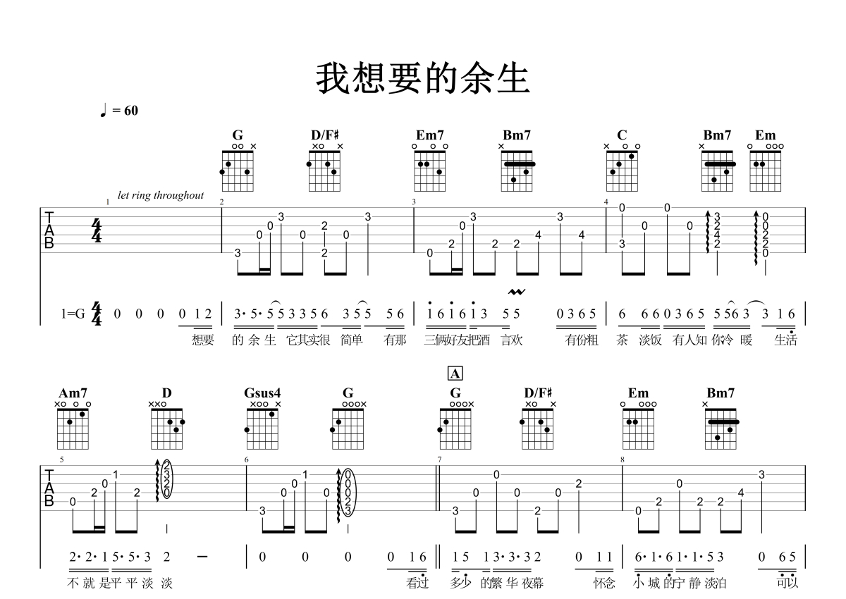 • 我想要的余生吉他谱 - 王一一 - G调吉他弹唱谱 - 石头音乐原版记谱第1张
