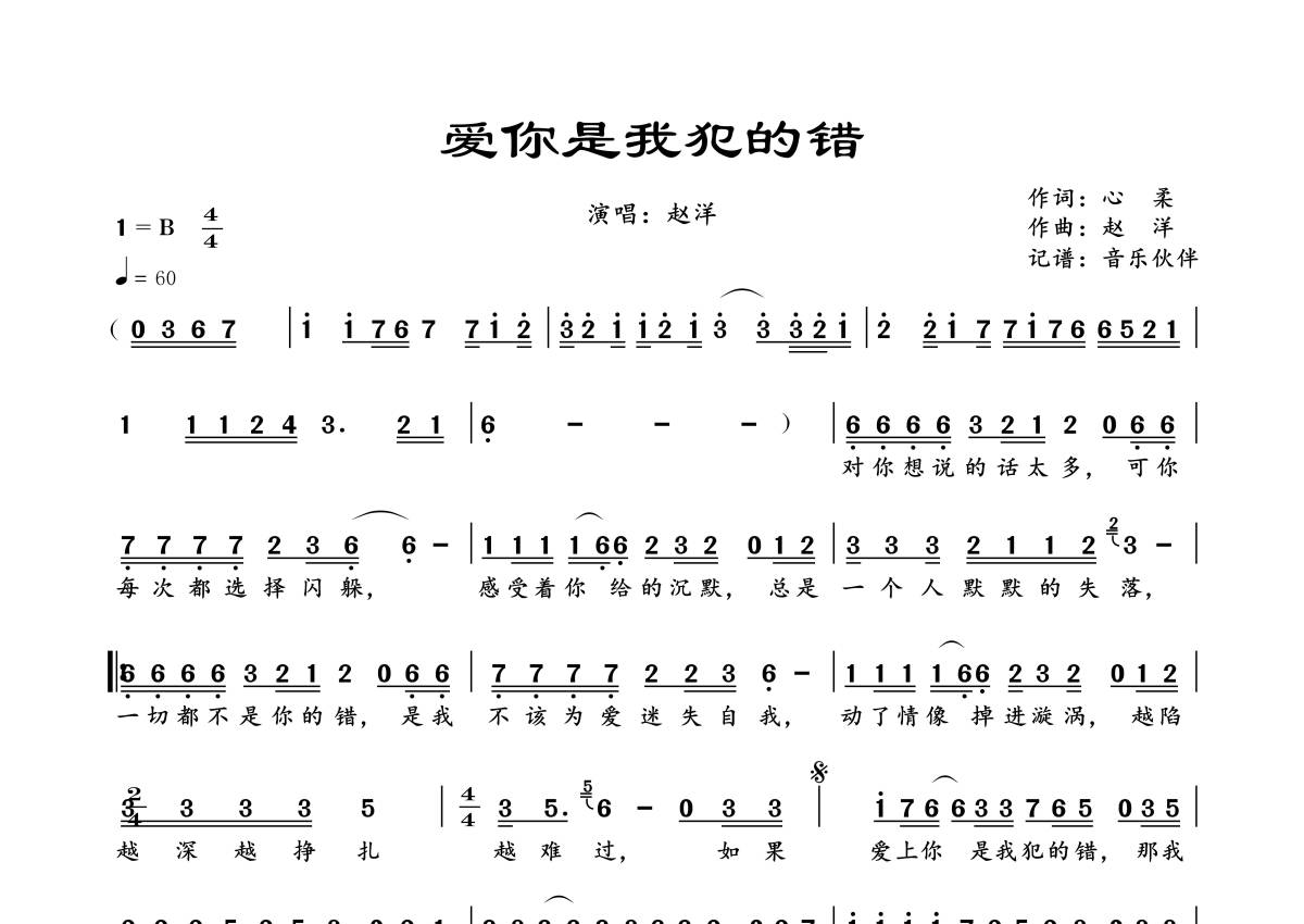 曲谱介绍: 赵洋《爱你是我犯的错》,音乐伙伴编配出品,共有1张高清图谱,免翻页排版设计。