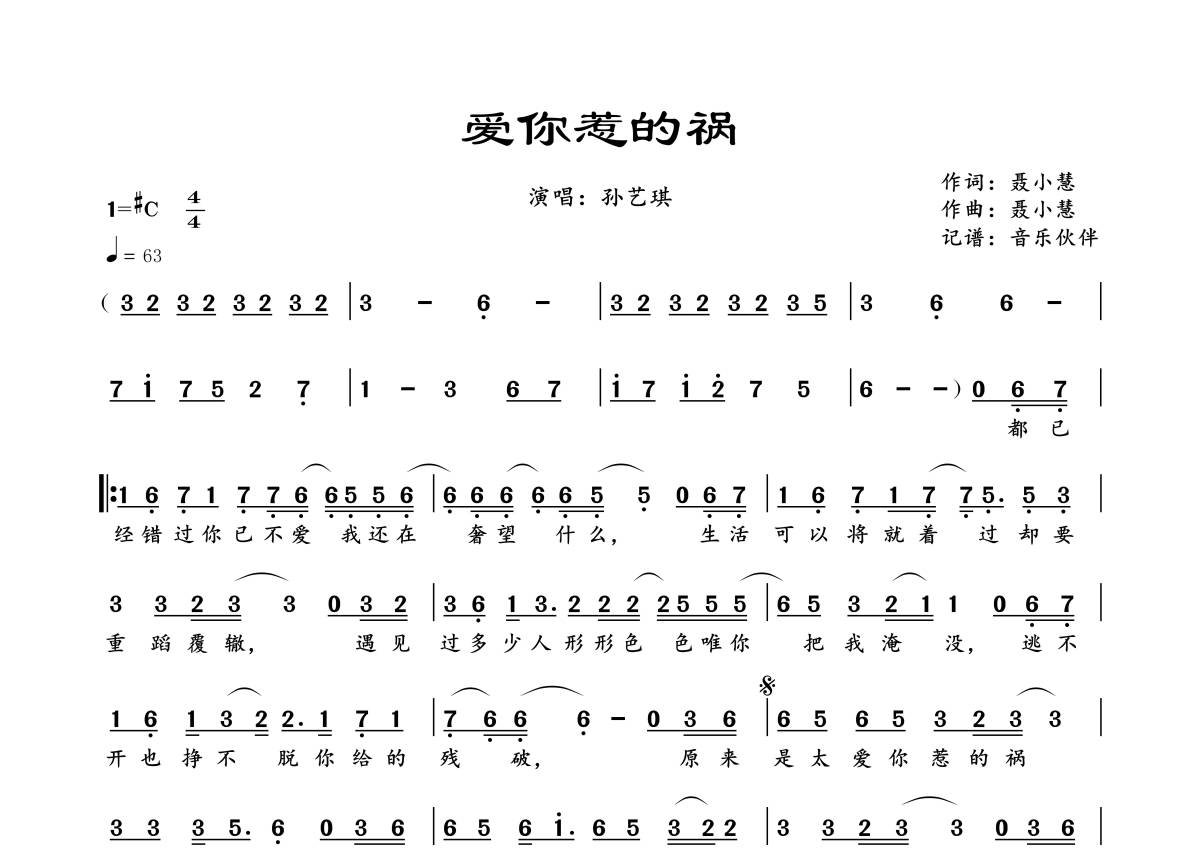 曲谱介绍: 孙艺琪《爱你惹的祸》,音乐伙伴编配出品,共有1张高清图谱,免翻页排版设计。