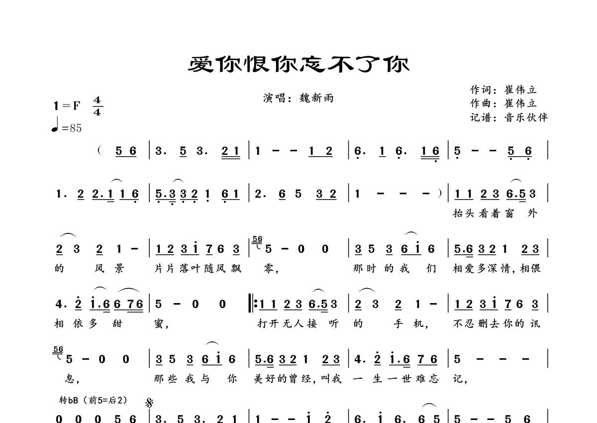 曲谱介绍: 魏新雨《爱你恨你忘不了你》,音乐伙伴编配出品,共有1张高清图谱,免翻页排版设计。