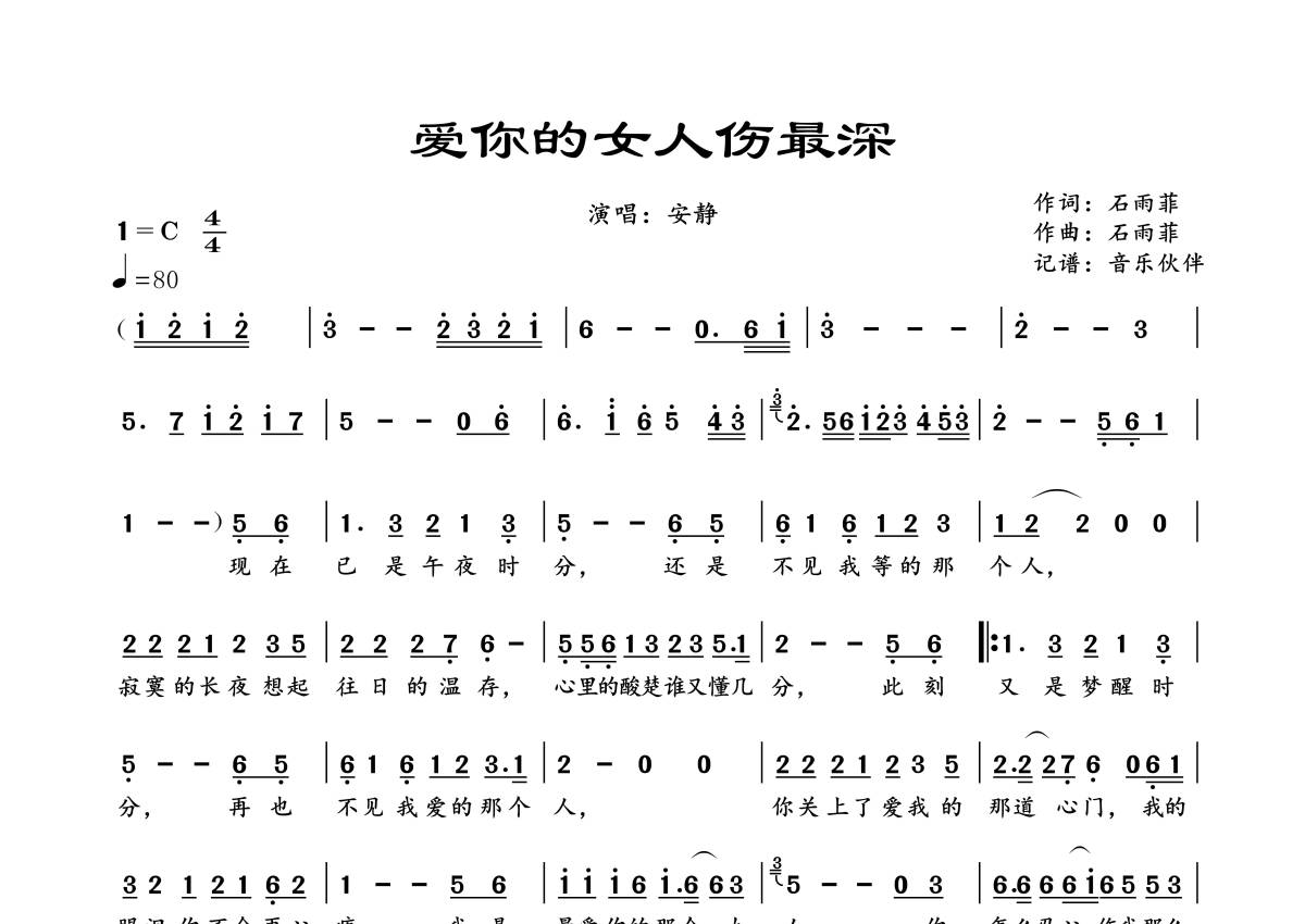 曲谱介绍: 安静《爱你的女人伤最深》,音乐伙伴编配出品,共有1张高清图谱,免翻页排版设计。