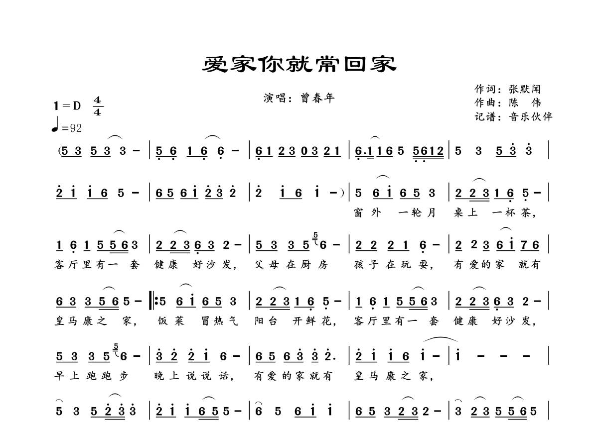 爱家你就常回家简谱 - 曾春年