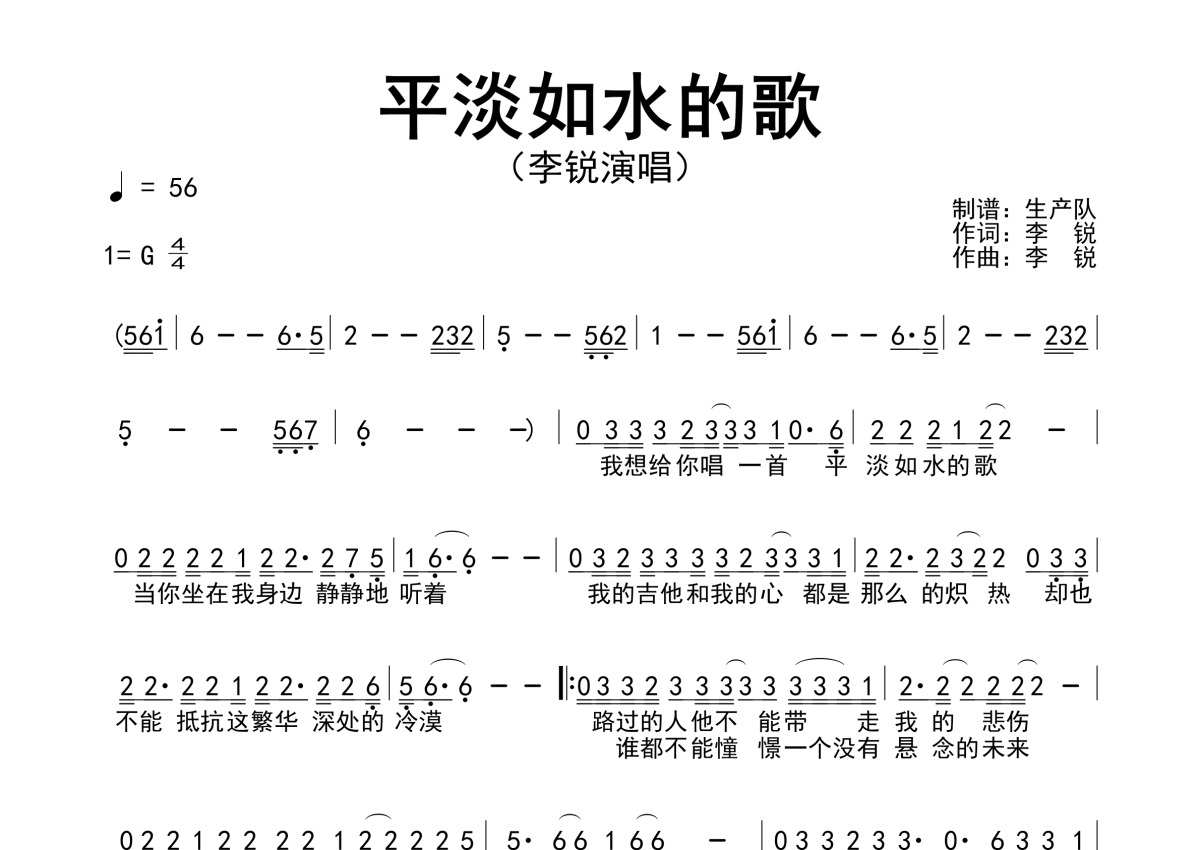 曲谱介绍: 李锐《平淡如水的歌》原版简谱,生产队编配出品,共有1张高清图谱,免翻页排版设计。