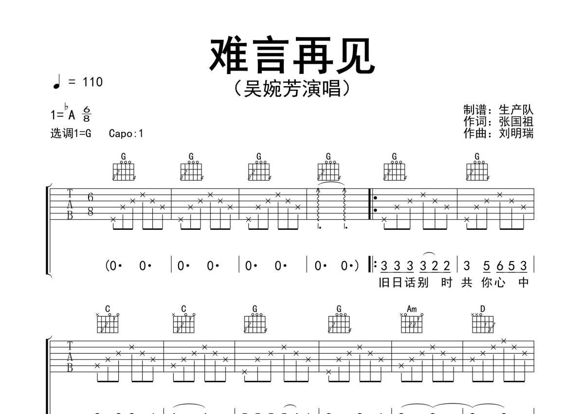 曲谱介绍: 吴婉芳《难言再见》吉他弹唱谱,采用G调指法编配精编民谣版,生产队编配出品,共有3张高清图谱。