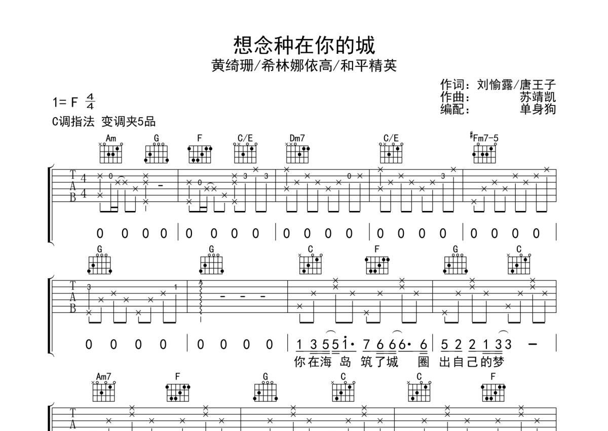 曲谱介绍: 黄绮珊/希林娜依高/和平精英《想念种在你的城》吉他弹唱谱,采用C调指法编配,单身狗编配出品,共有3张高清图谱。