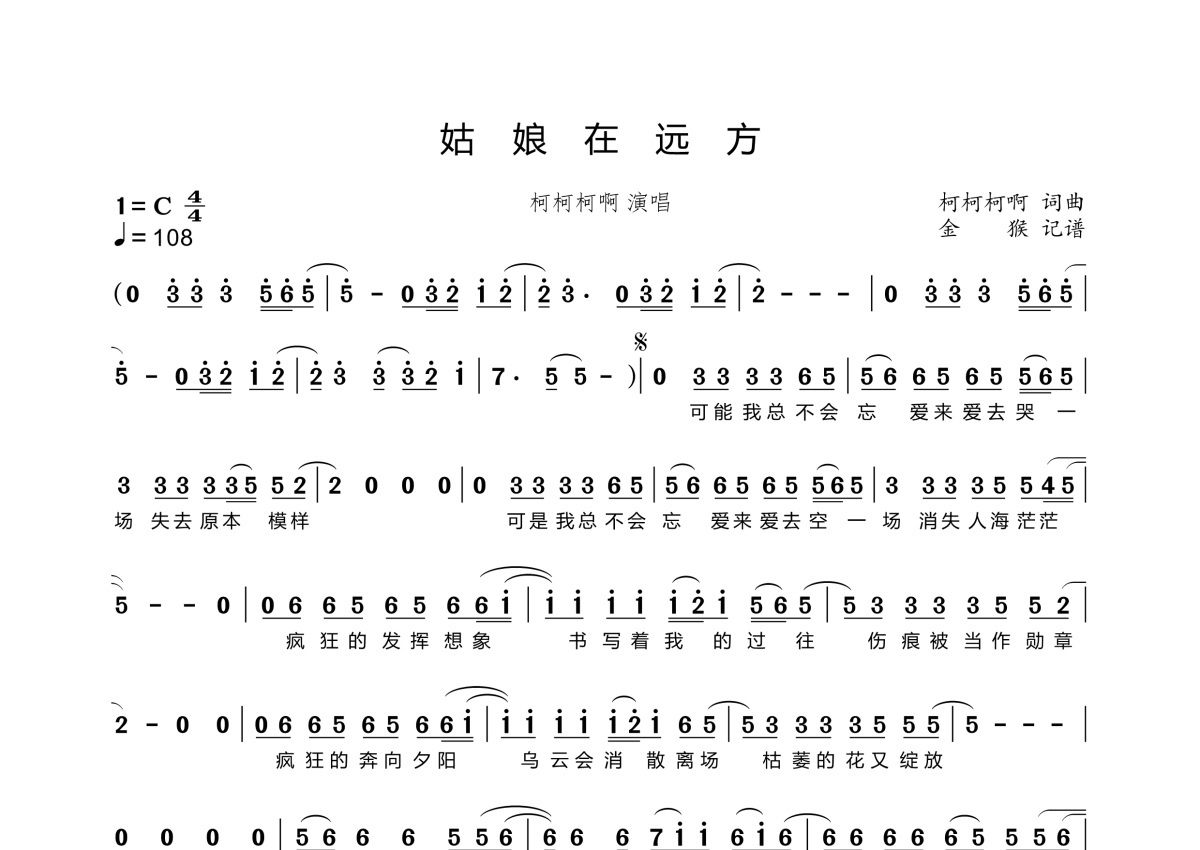 曲谱介绍: 柯柯柯啊《姑娘在远方》,金猴奋起千钧棒编配出品,共有1张高清图谱,免翻页排版设计。