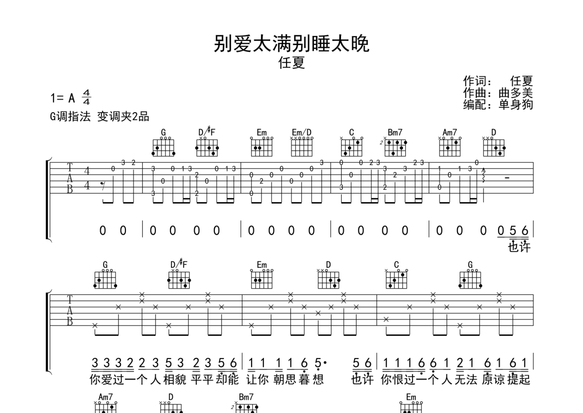 曲谱介绍: 任夏《别爱太满别睡太晚》吉他弹唱谱,采用G调指法编配,单身狗编配出品,共有2张高清图谱,免翻页排版设计。