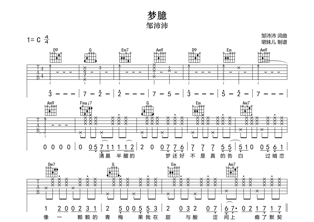 曲谱介绍: 邹沛沛《梦臆》吉他弹唱谱,采用C调指法编配,珺妹儿编配出品,共有3张高清图谱。