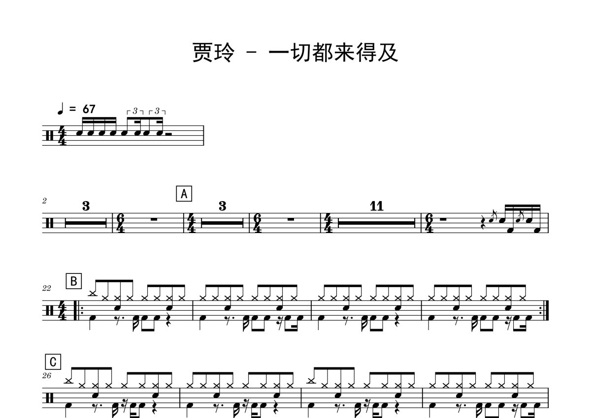 曲谱介绍: 贾玲《一切都来得及》架子鼓谱,Sawubona编配出品,共有2张高清图谱,免翻页排版设计。