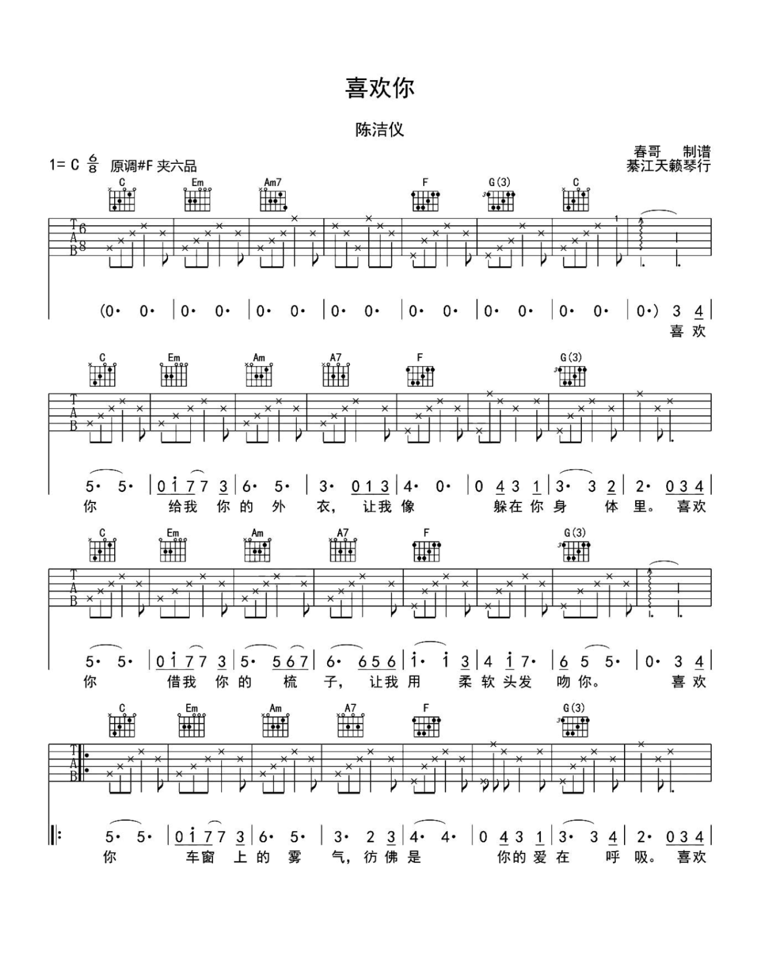 曲谱介绍: 喜欢你吉他谱,新加坡女歌手陈洁仪演唱版本,歌曲原调#F,选用C调,CAPO六品。这首《喜欢你》是一首痴情女子的爱情金曲,陈洁仪唱出了成熟女人的美好,我是歌手节目里面,徐佳莹则唱出小女生对爱情的憧憬,歌声里有着宛若初见的纯净,含蓄而又果敢。