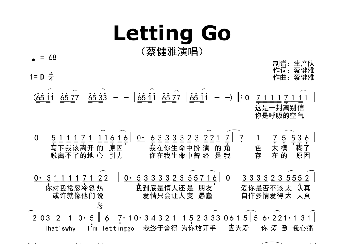 • Letting Go简谱 - 蔡健雅 - 原版简谱第1张