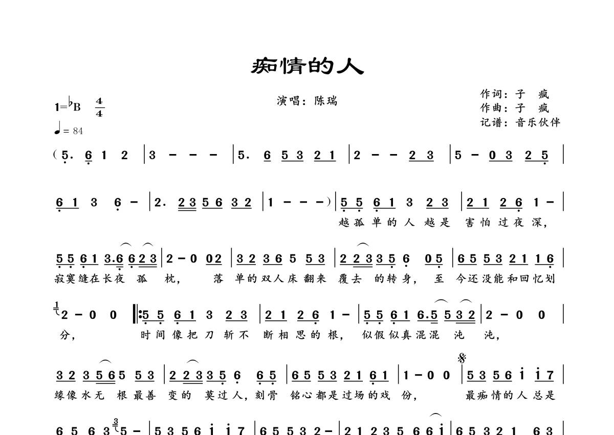 曲谱介绍: 陈瑞《痴情的人》,音乐伙伴编配出品,共有1张高清图谱,免翻页排版设计。