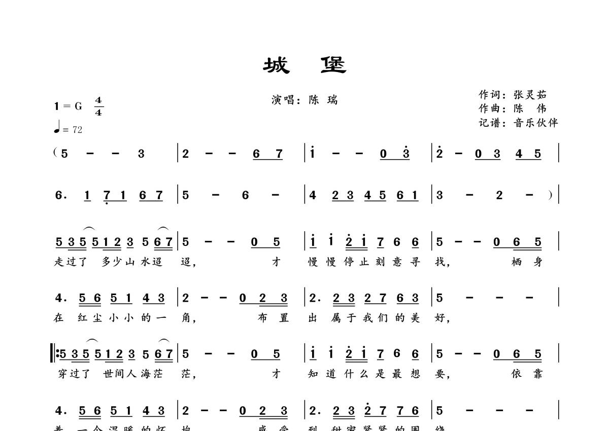 曲谱介绍: 陈瑞《城堡》,音乐伙伴编配出品,共有1张高清图谱,免翻页排版设计。
