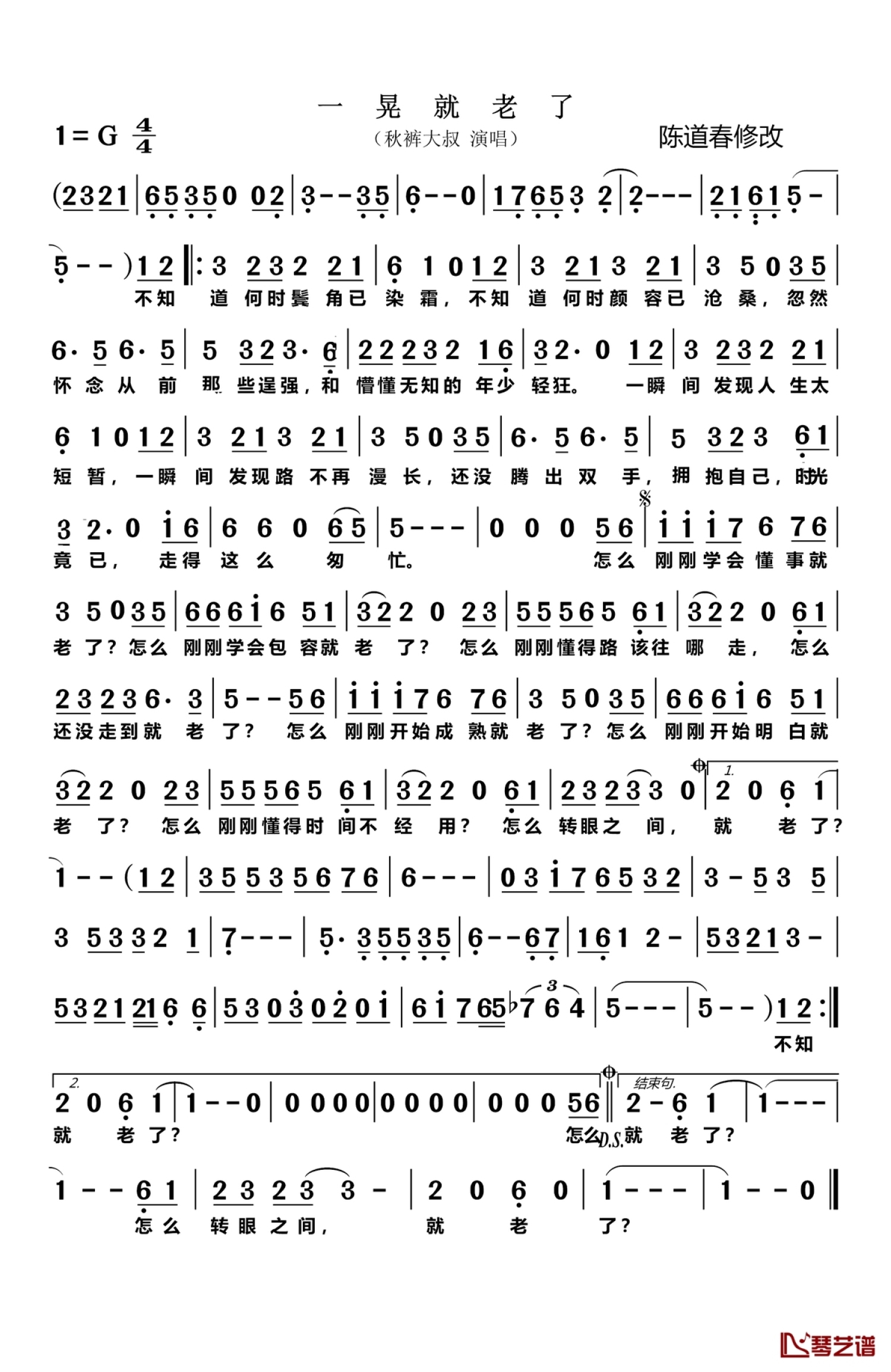 曲谱介绍: 秋裤大叔《一晃就老了》歌词_简谱