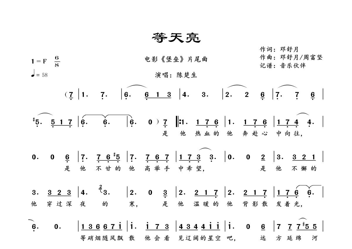 曲谱介绍: 陈楚生《等天亮》,音乐伙伴编配出品,共有1张高清图谱,免翻页排版设计。