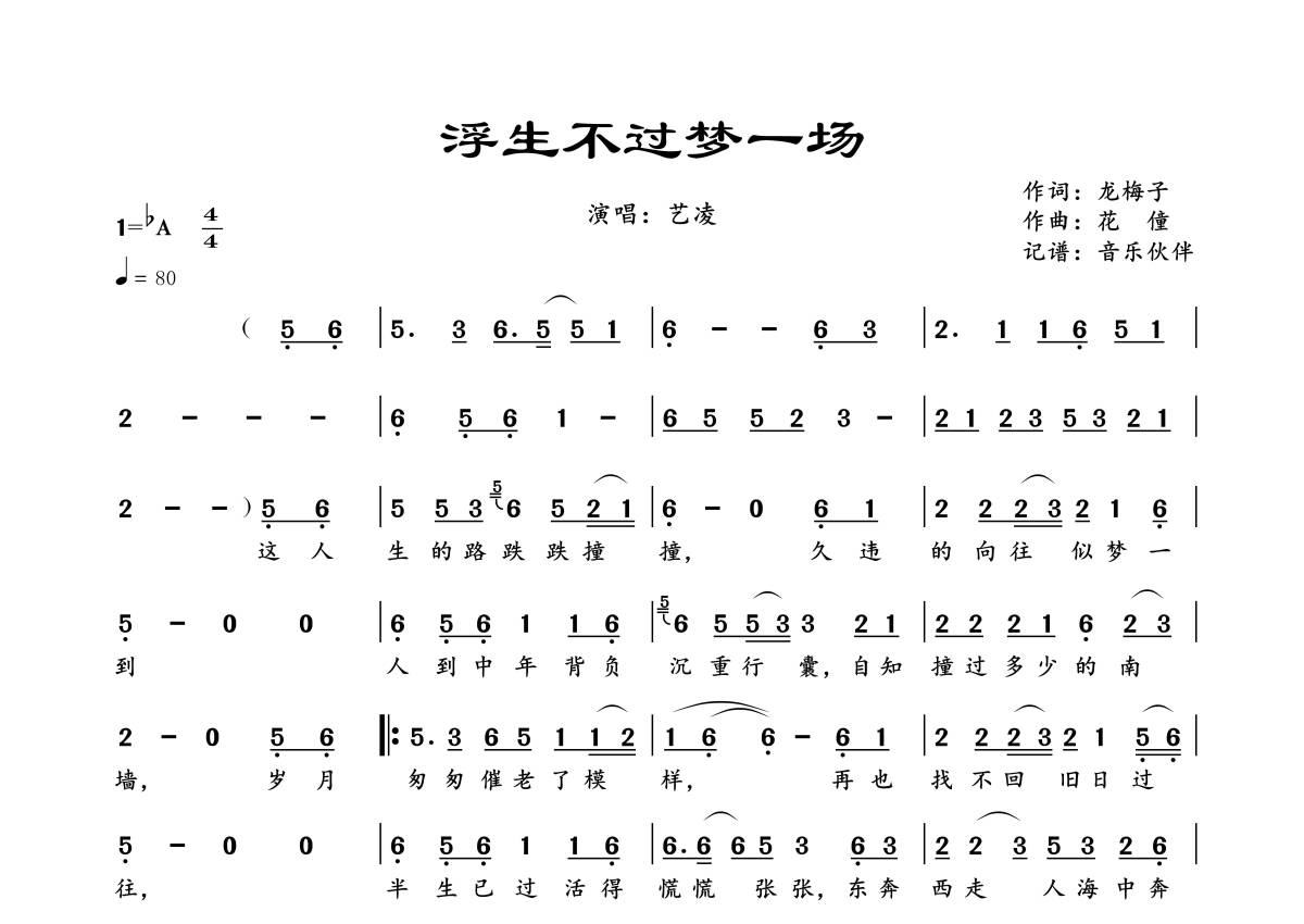 曲谱介绍: 艺凌《浮生不过梦一场》,音乐伙伴编配出品,共有1张高清图谱,免翻页排版设计。