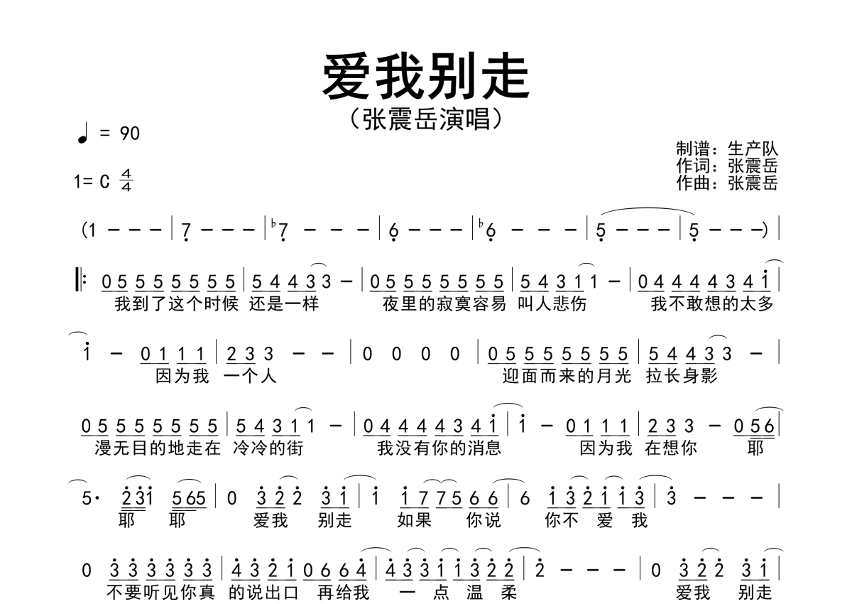 曲谱介绍: 张震岳《爱我别走》原版简谱,生产队编配出品,共有1张高清图谱,免翻页排版设计。