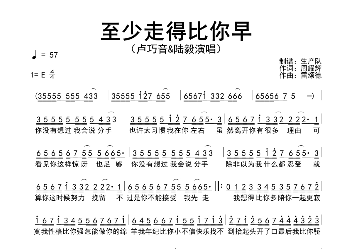 曲谱介绍: 陆毅&卢巧音《至少走得比你早》原版简谱,生产队编配出品,共有1张高清图谱,免翻页排版设计。