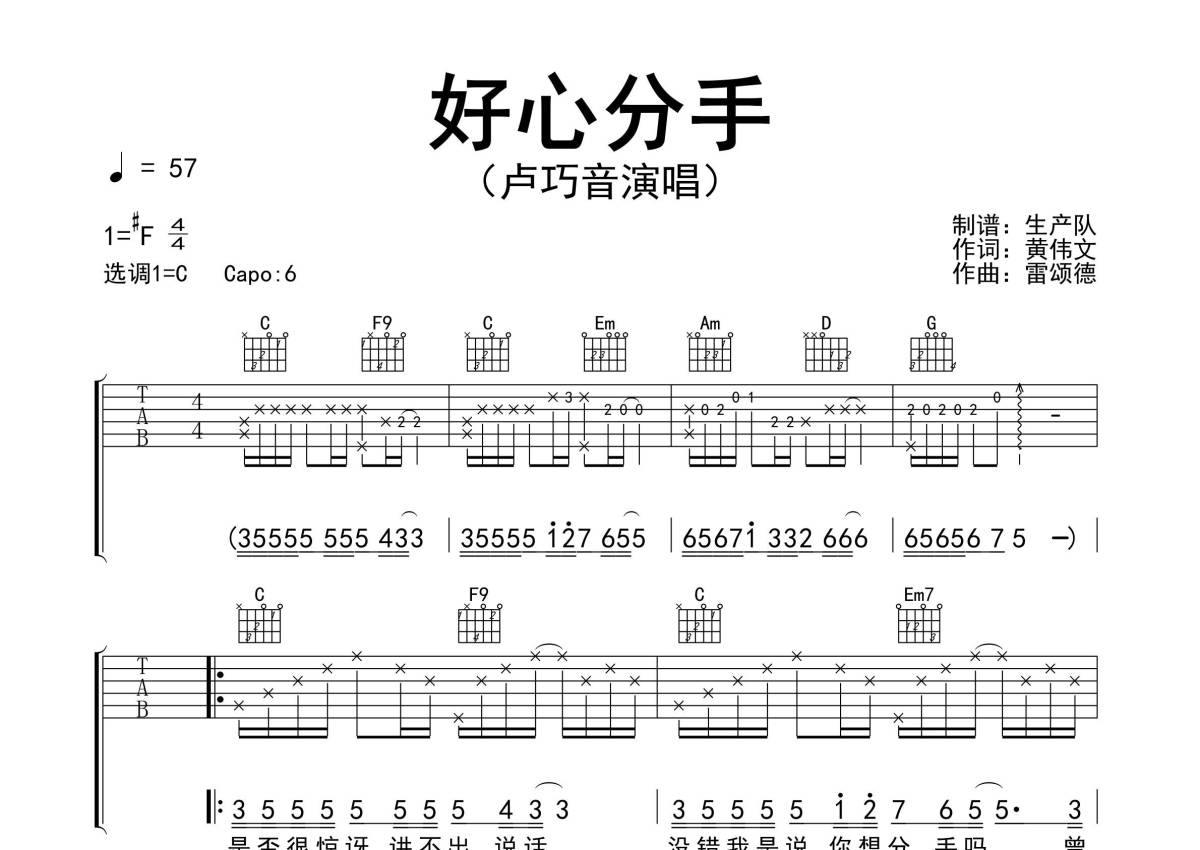 曲谱介绍: 卢巧音《好心分手》吉他弹唱谱,采用C调指法编配精编民谣版,生产队编配出品,共有3张高清图谱。