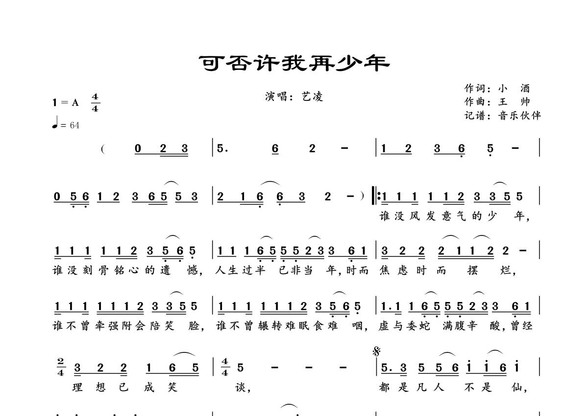 曲谱介绍: 艺凌《可否许我再少年》,音乐伙伴编配出品,共有1张高清图谱,免翻页排版设计。