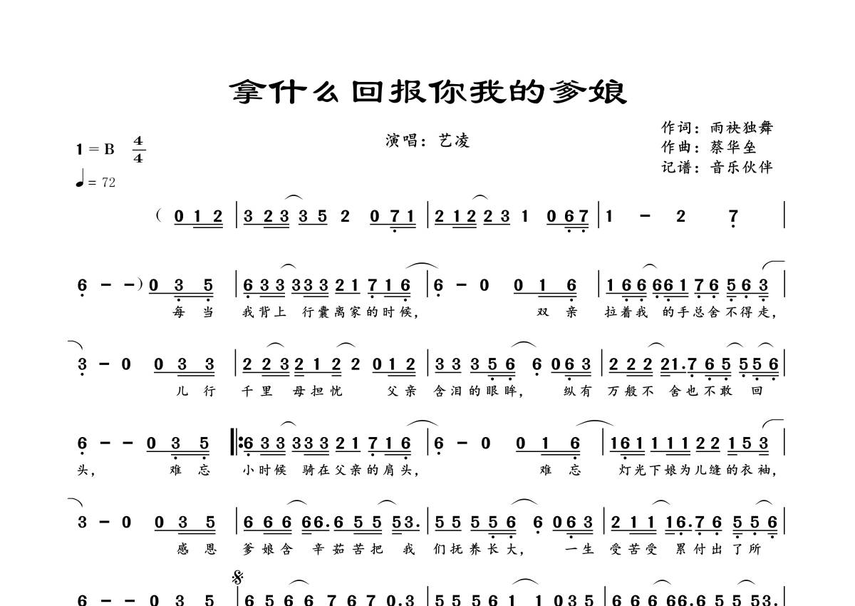 曲谱介绍: 艺凌《拿什么回报你我的爹娘》,音乐伙伴编配出品,共有1张高清图谱,免翻页排版设计。