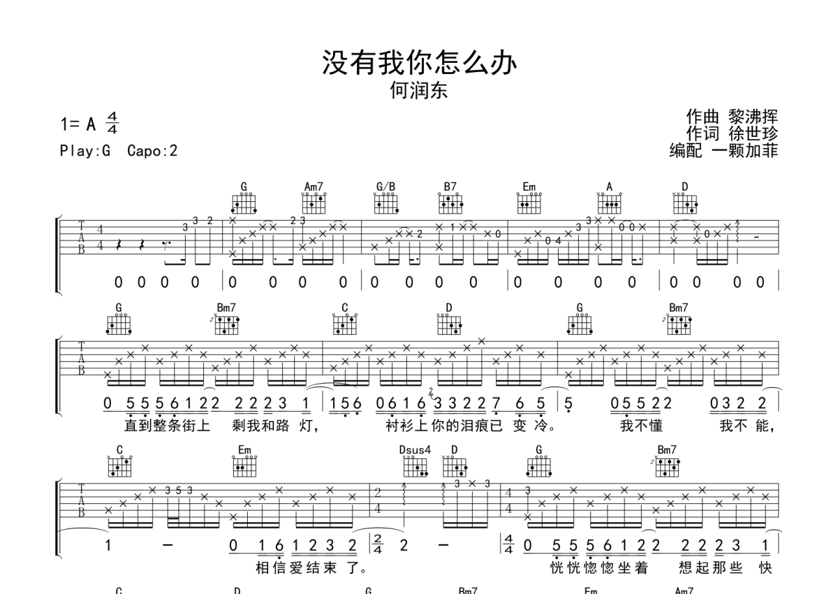 曲谱介绍: 何润东《没有我你怎么办》吉他弹唱谱,采用G调指法编配,一颗加菲编配出品,共有3张高清图谱。