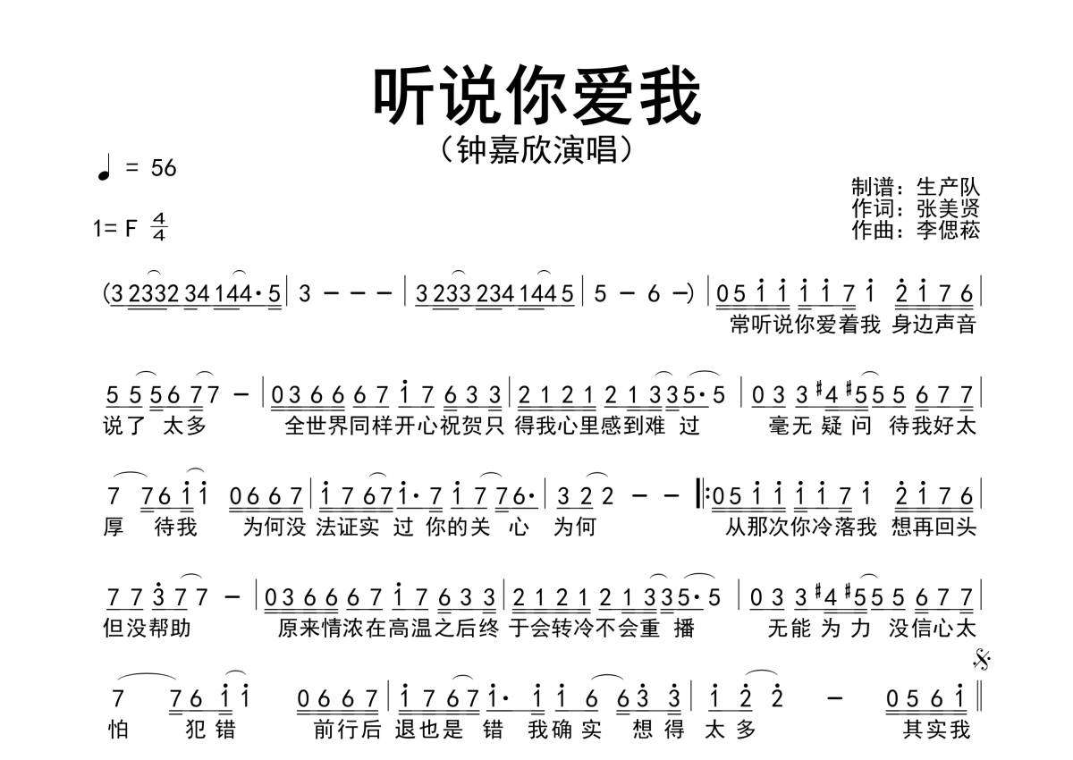 曲谱介绍: 钟嘉欣《听说你爱我》原版简谱,生产队编配出品,共有1张高清图谱,免翻页排版设计。