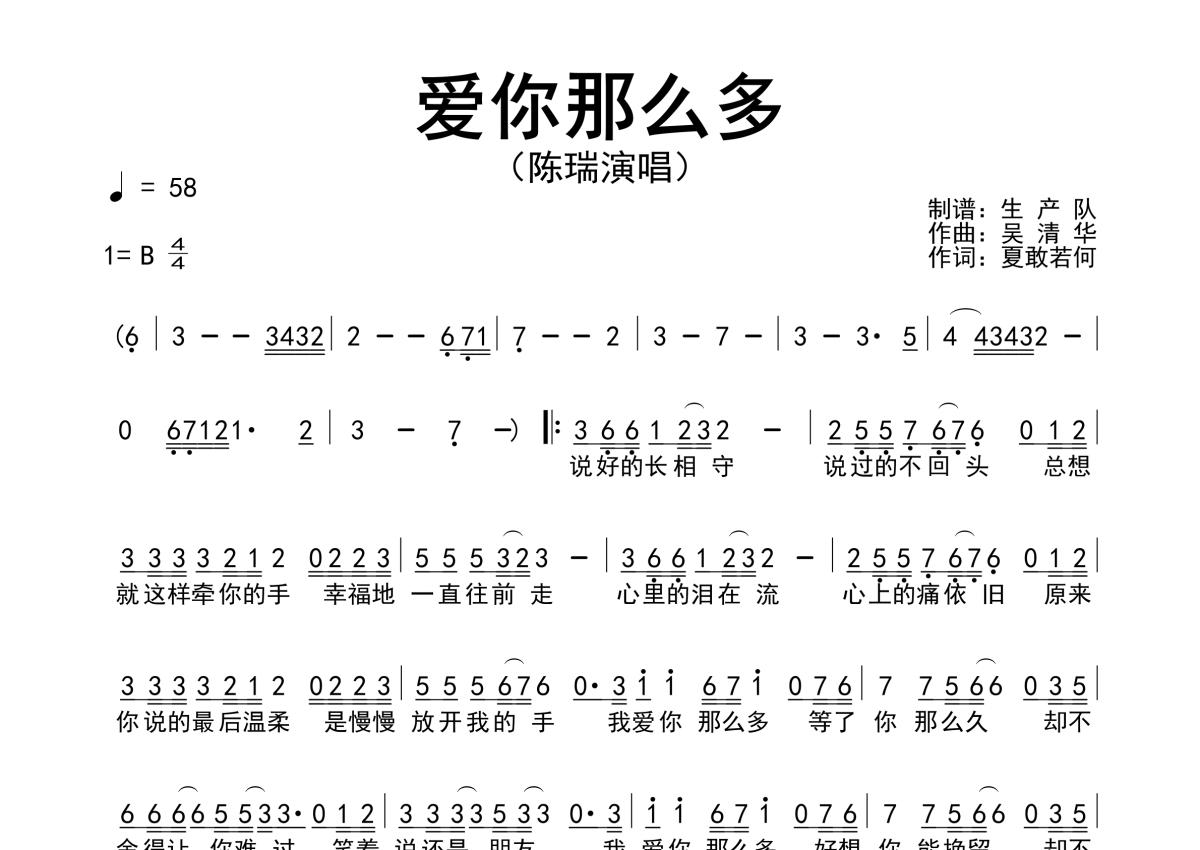 曲谱介绍: 陈瑞《爱你那么多》原版简谱,生产队编配出品,共有1张高清图谱,免翻页排版设计。
