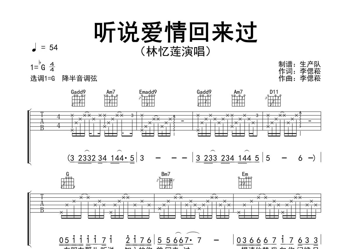 曲谱介绍: 林忆莲《听说爱情回来过》吉他弹唱谱,采用G调指法编配精编完美版,生产队编配出品,共有3张高清图谱。