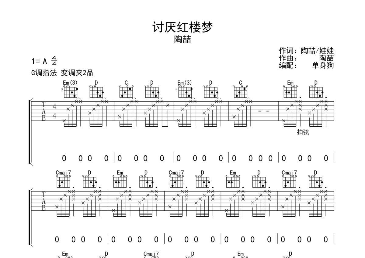 曲谱介绍: 陶喆《讨厌红楼梦》吉他弹唱谱,采用G调指法编配,单身狗编配出品,共有5张高清图谱。