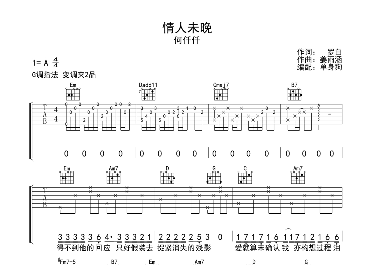 曲谱介绍: 何仟仟《情人未晚》吉他弹唱谱,采用G调指法编配,单身狗编配出品,共有3张高清图谱。