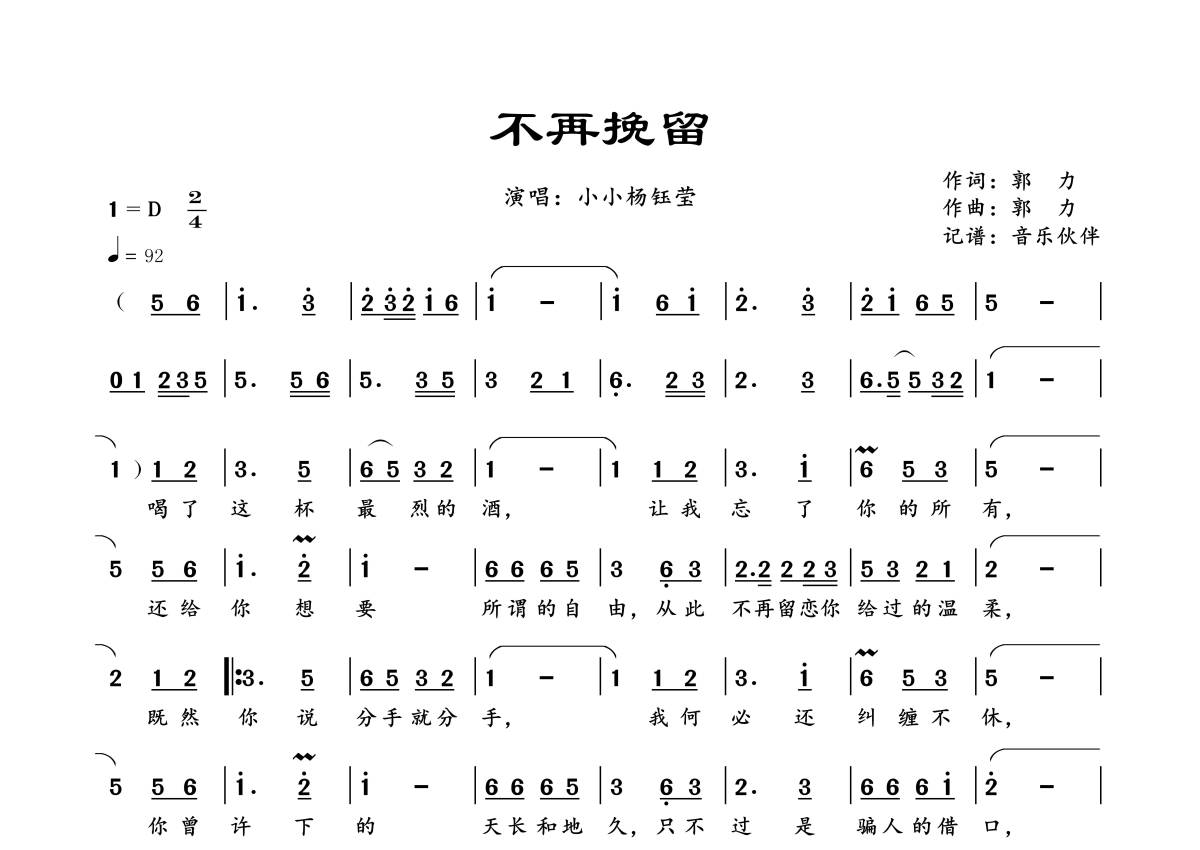 曲谱介绍: 小小杨钰莹《不再挽留》,音乐伙伴编配出品,共有1张高清图谱,免翻页排版设计。