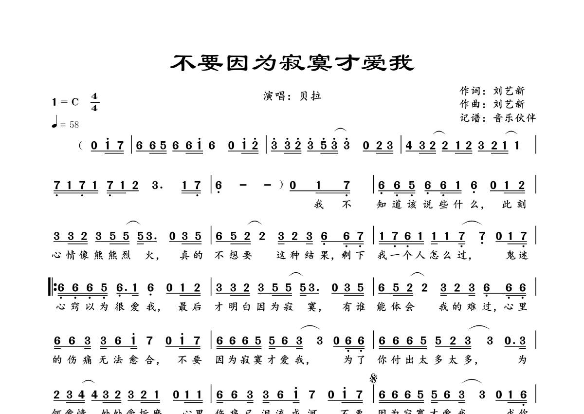 曲谱介绍: 贝拉《不要因为寂寞才爱我》,音乐伙伴编配出品,共有1张高清图谱,免翻页排版设计。