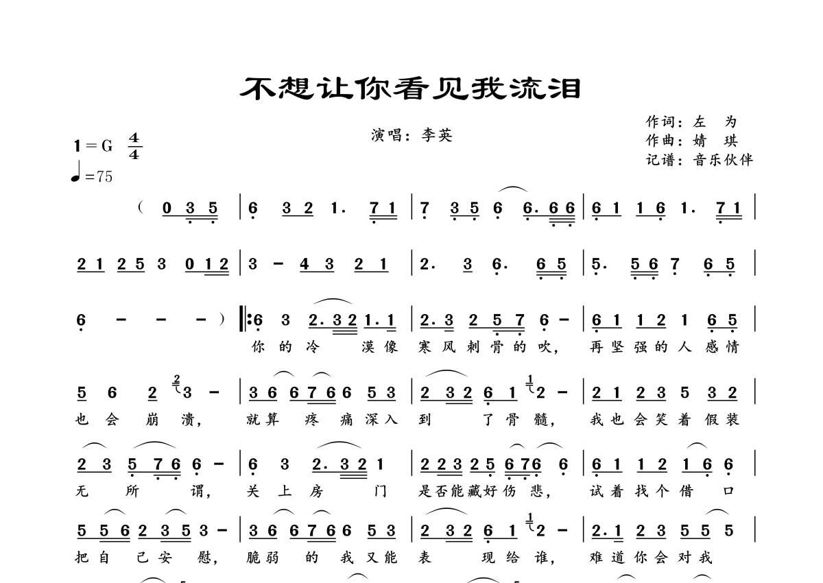 曲谱介绍: 李英《不想让你看见我流泪》,音乐伙伴编配出品,共有1张高清图谱,免翻页排版设计。