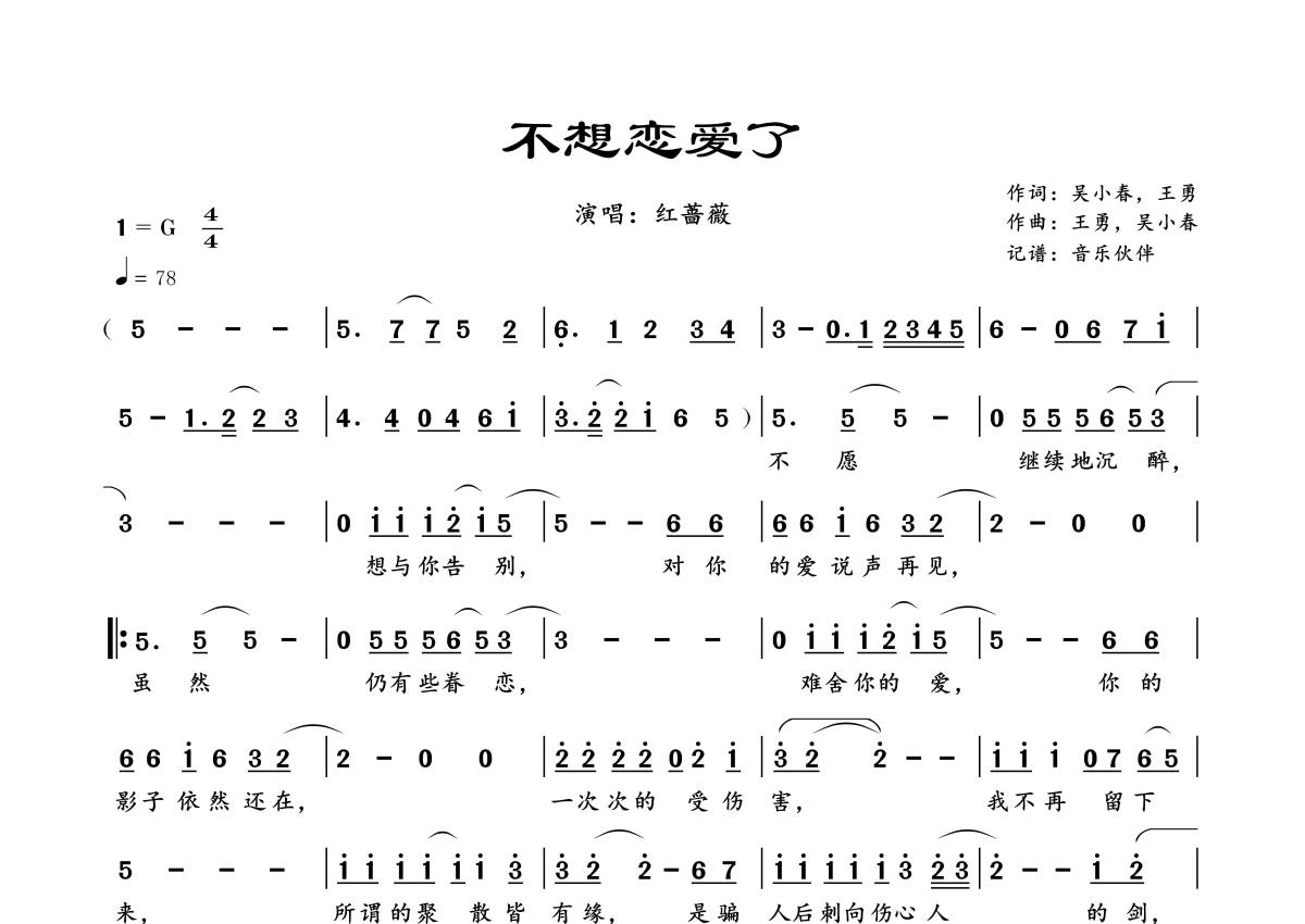 曲谱介绍: 红蔷薇《不想恋爱了》,音乐伙伴编配出品,共有1张高清图谱,免翻页排版设计。