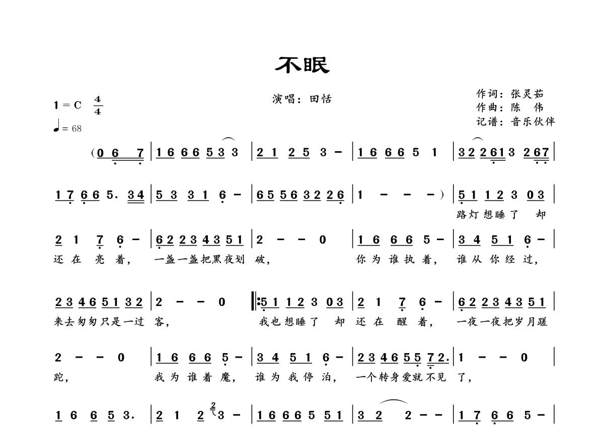 曲谱介绍: 田恬《不眠》,音乐伙伴编配出品,共有1张高清图谱,免翻页排版设计。