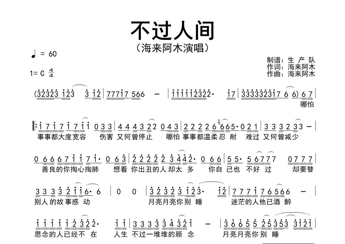 曲谱介绍: 海来阿木《不过人间》简谱,生产队编配出品,共有1张高清图谱,免翻页排版设计。