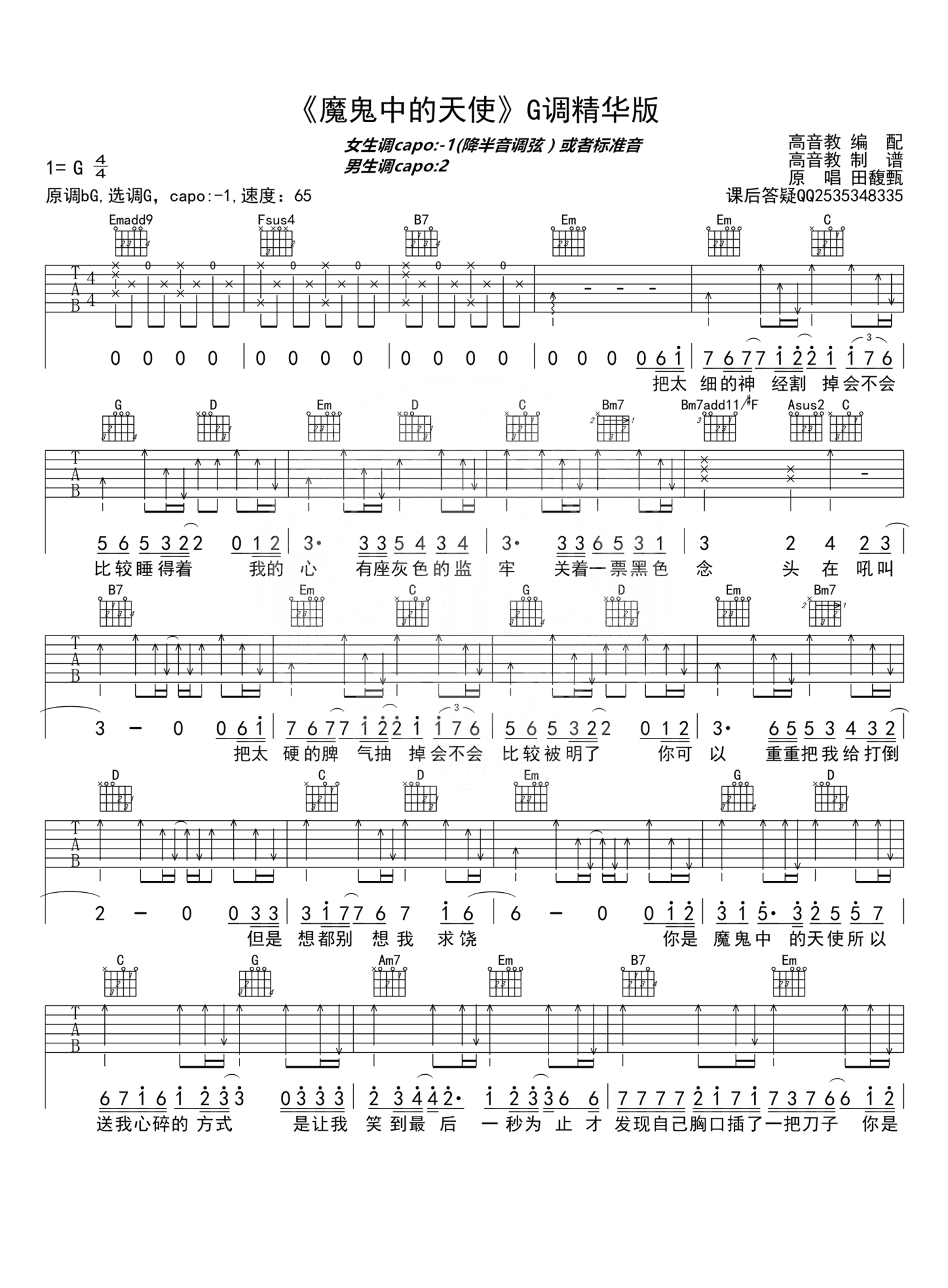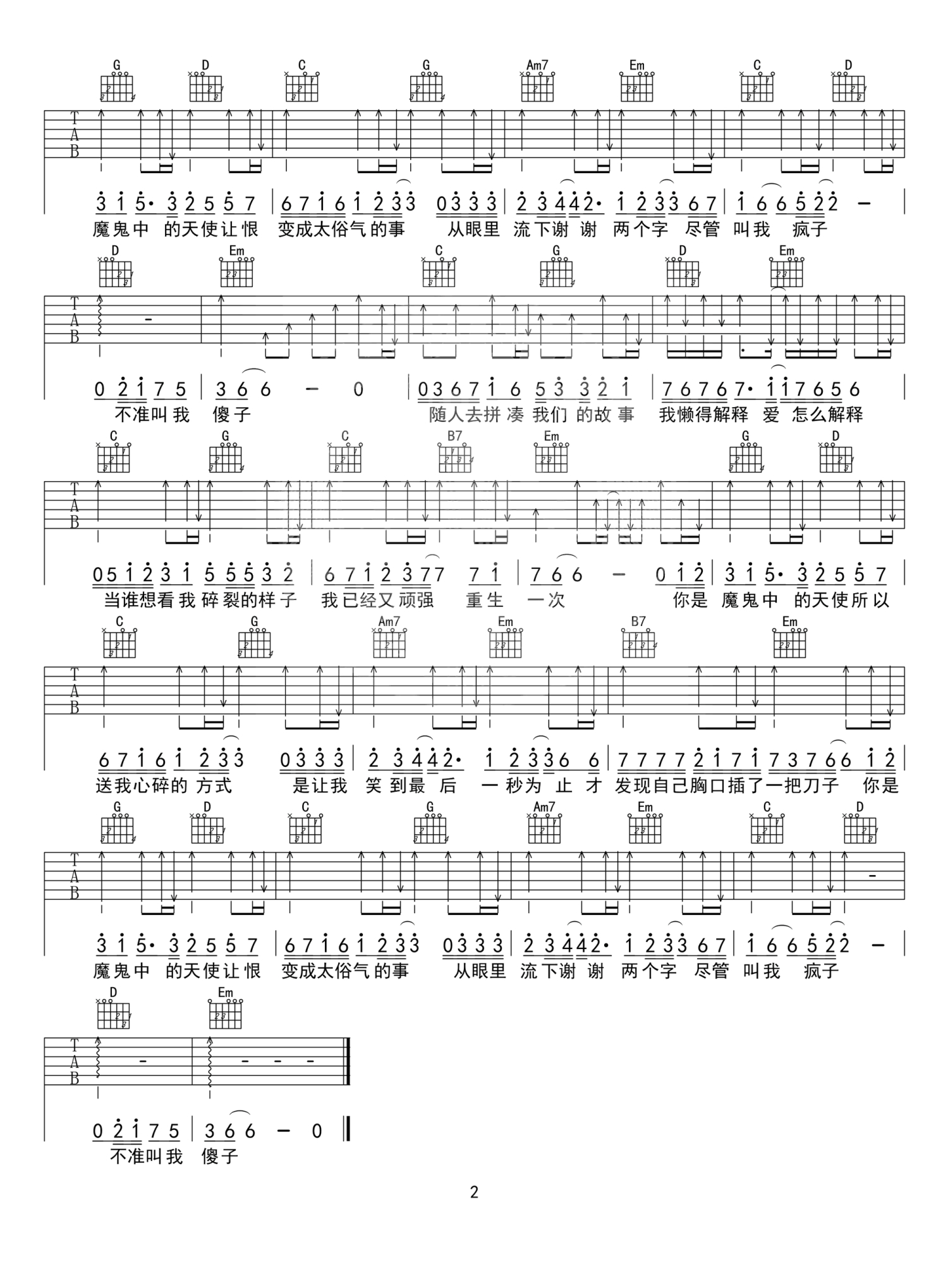 魔鬼中的天使吉他谱 - 田馥甄 - G调吉他弹唱谱