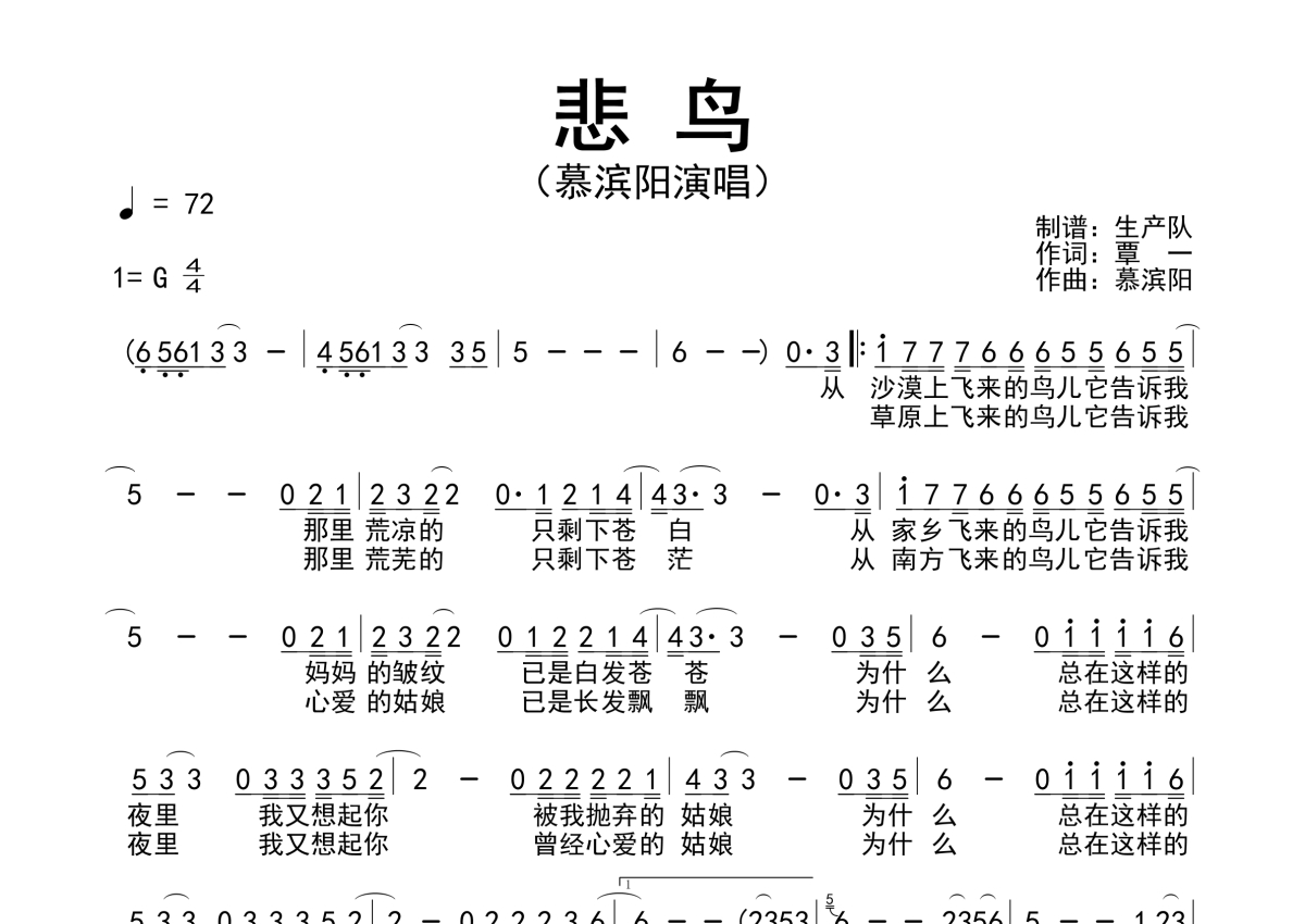 曲谱介绍: 慕滨阳《悲鸟》原版简谱,生产队编配出品,共有1张高清图谱,免翻页排版设计。