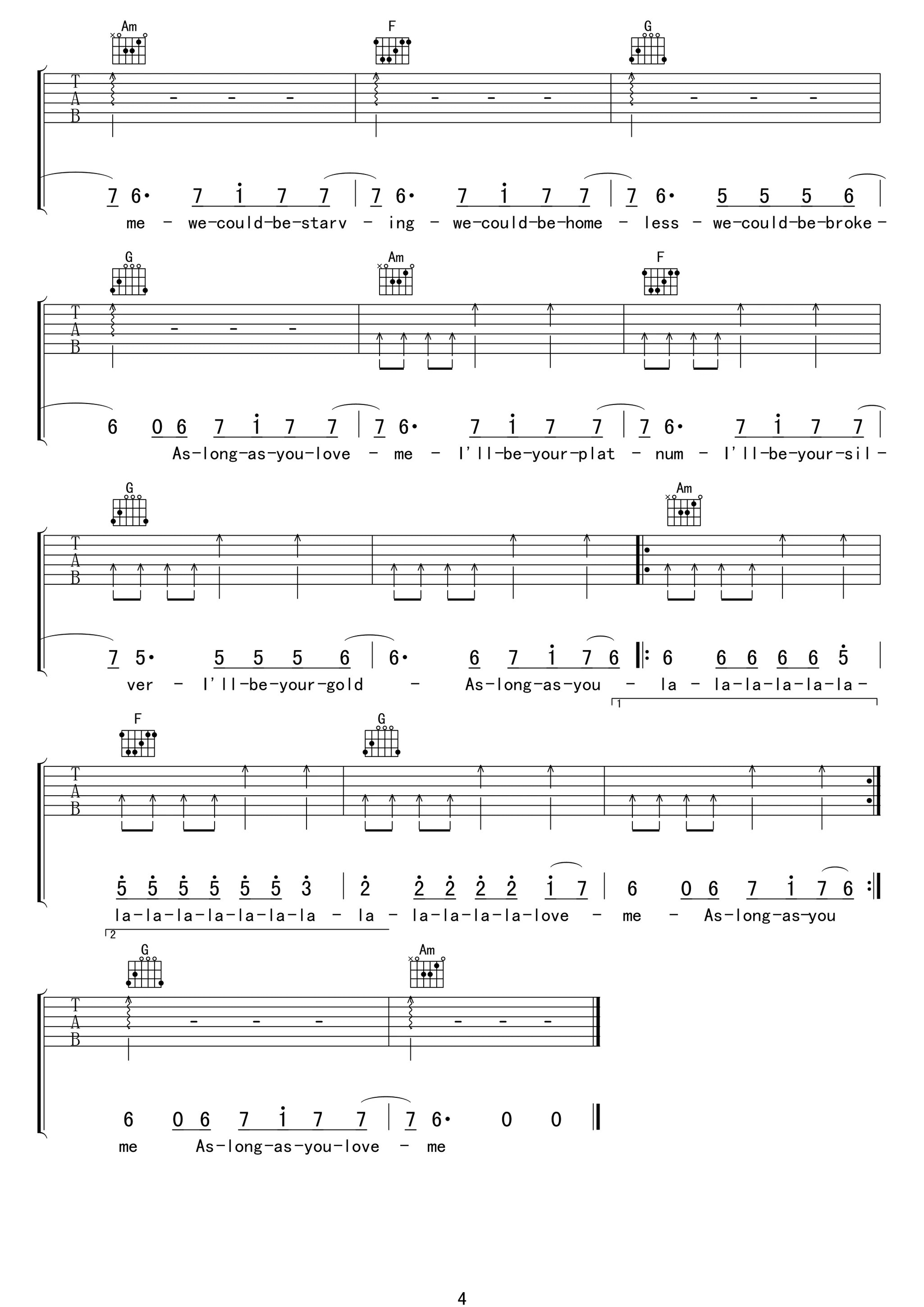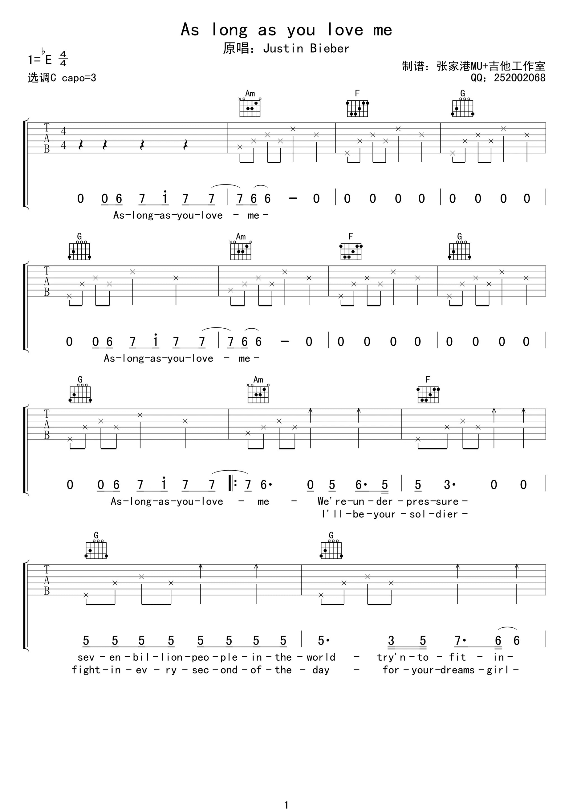 曲谱介绍: As long as you love me吉他谱采用了E调指法,由张家港MU+吉他编配完成。这是由加拿大男歌手Justin·Bieber和美国嘻哈歌手Big Sean合作演唱的一首流行歌曲,这首歌曲曾经获得了美国版权协会流行音乐奖最佳录唱歌曲奖项,这首歌凭借着清新的曲风和很有节奏感的旋律,深受很多年轻人的支持和喜爱,在这首歌曲里面洋溢着青春的味道,而且还唱出了许多人的爱情观,体现了一个为爱奋不顾身,不惧一切阻挠的形象。另外,这首目前吉他谱也超级好听,小伙伴们有福啦,还不去练起来?