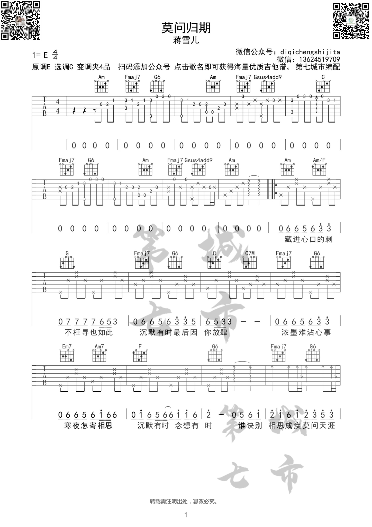曲谱介绍: 本曲谱由第七城市编配制作,曲谱选用C调和弦,变调夹4品,适合进阶的吉他玩家。《莫问归期》是由蒋雪儿演唱的歌曲,这是一首极具古风韵味的歌曲将传统的曲艺风格和现代流行音乐的节奏相结合,在西洋乐器和民族乐器的结合中寻找最佳的融合点,用自己独特的嗓音唱出相思之苦。前奏叮咚,如水般温柔,副歌部分带有一丝戏曲唱腔,看似轻巧却暗含了离别的哀愁,一直单曲循环也听不腻~