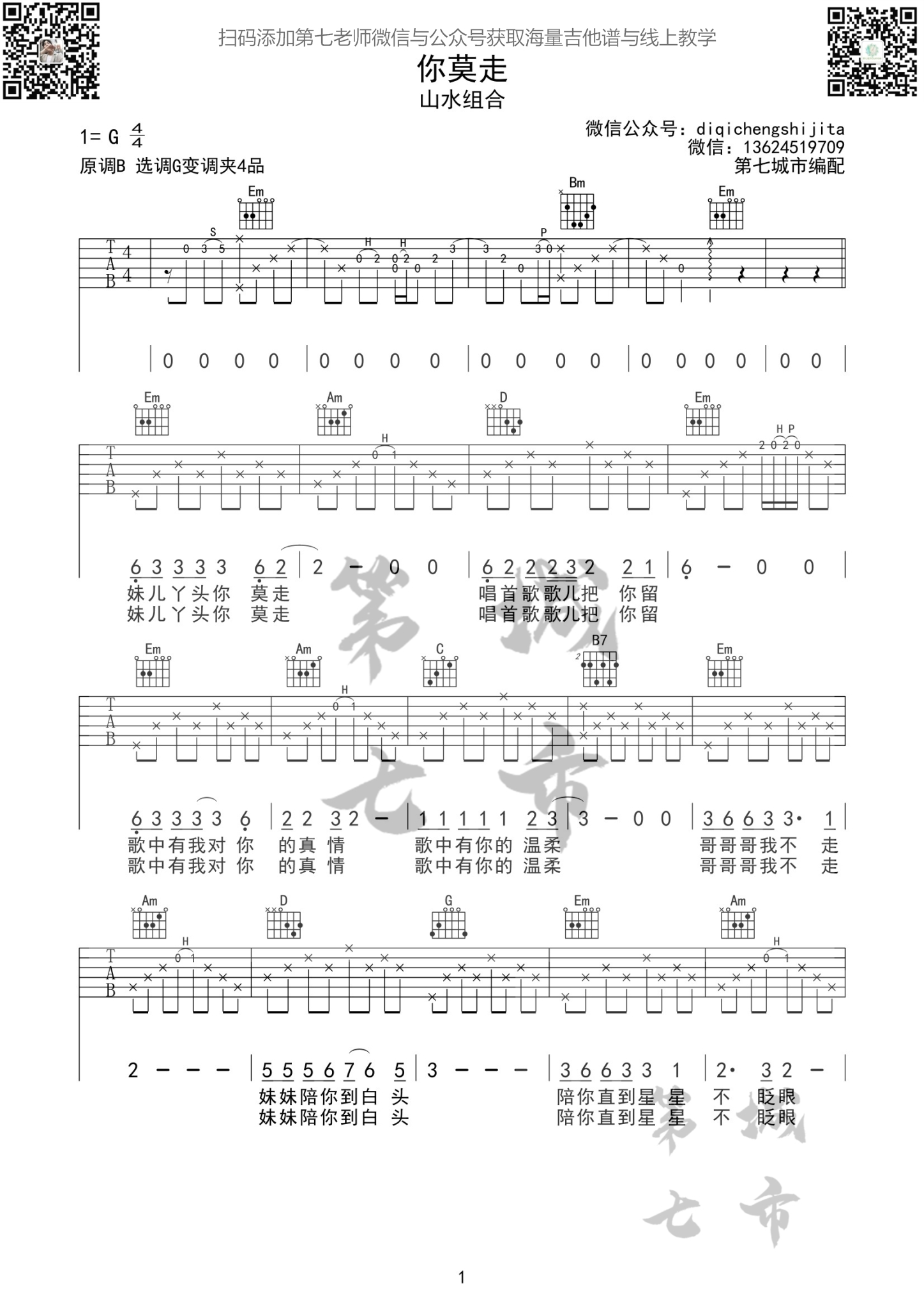曲谱介绍: 本曲谱由第七城市编配制作,曲谱选用G调和弦,变调夹4品,包含一种横按和弦,适合进阶的吉他玩家。山野民谣《你莫走》,由山水组合演唱。歌词朴素纯美,勾勒出原生态的乡村爱情。歌中男声粗犷豪迈,女声细腻温柔,哥哥有力量,妹妹有柔情。一声“你莫走”,一声“我不走”,喊醒了爱情的记忆。所有的宣泄、憧憬与甜蜜在这首歌的声线里表达的淋漓尽致。唱出了湘西土匪和压寨夫人的爱情故事