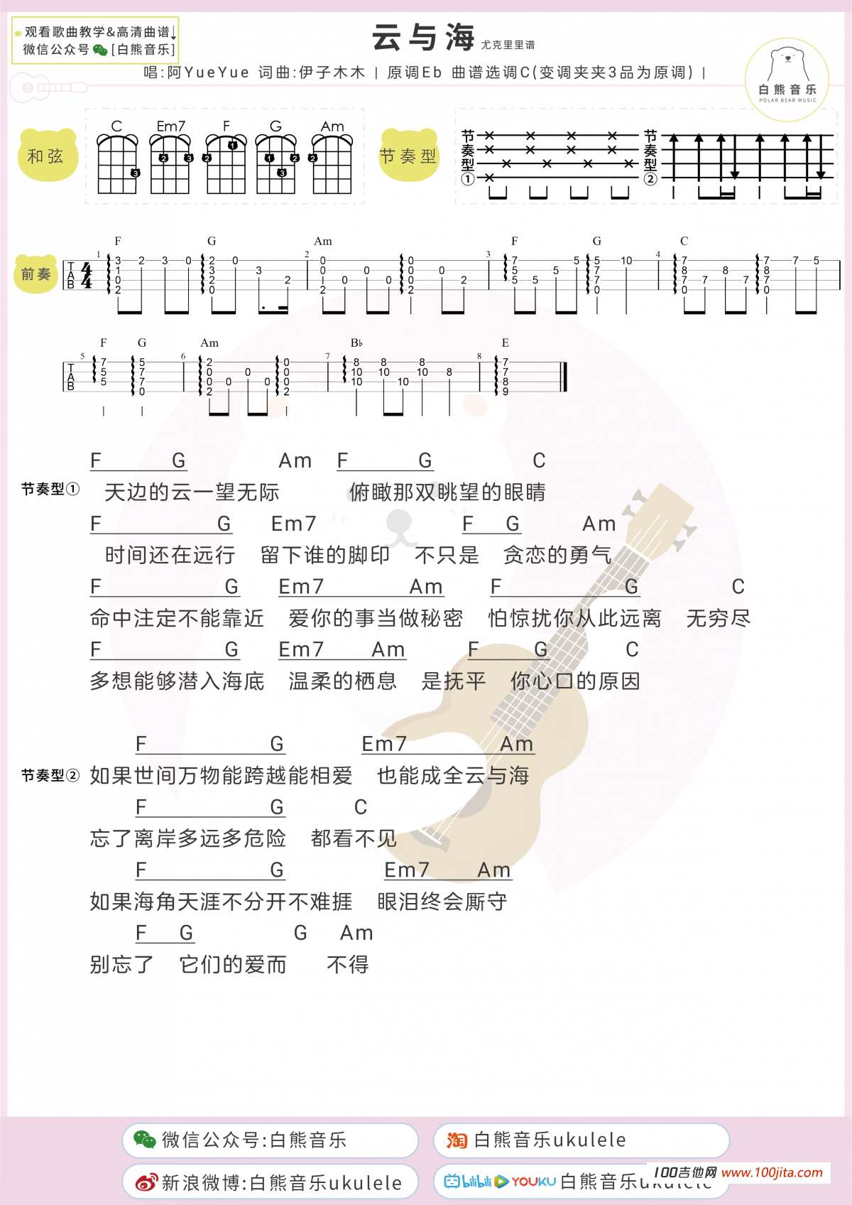 曲谱介绍: 《云与海》尤克里里谱是根据歌手阿YueYue的一首经典歌曲编配的谱子。谱子采用C调和弦指法编配,夹三品是原调。谱子中详细描述了前奏部分的指法和分解和弦、扫弦的节奏型。喜欢的朋友一定要收藏哦。琴谱网编辑整理。