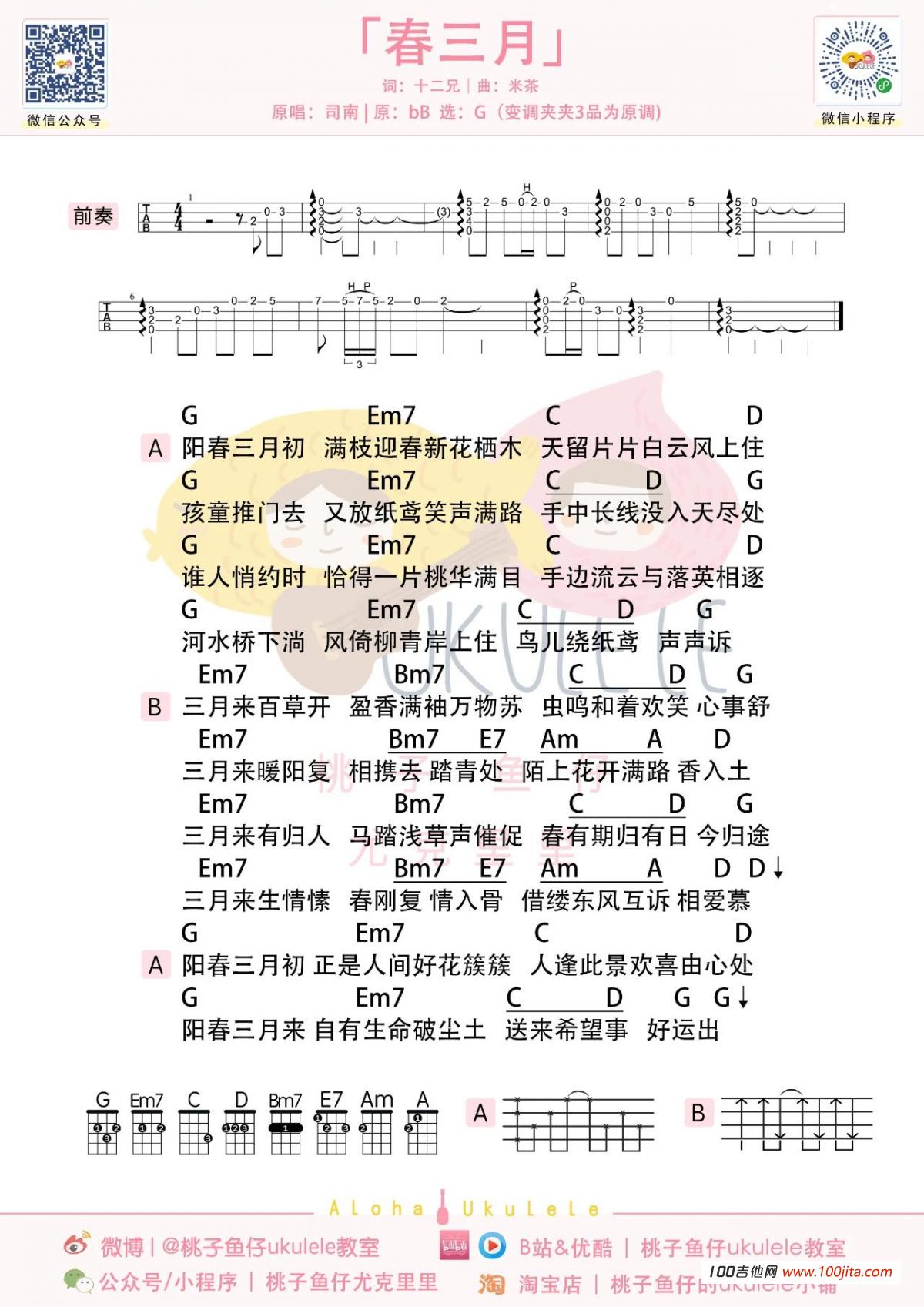 曲谱介绍: 春三月尤克里里谱提供给大家。阳春三月万物复苏,司南带给大家的这首歌曲,也许让人耳目一新。弹奏的时候结合谱子的标注。和弦和节奏型都有讲解,喜欢的朋友弹唱一下哦。谱子版本不多大家收藏一下哦,琴谱网编辑整理。