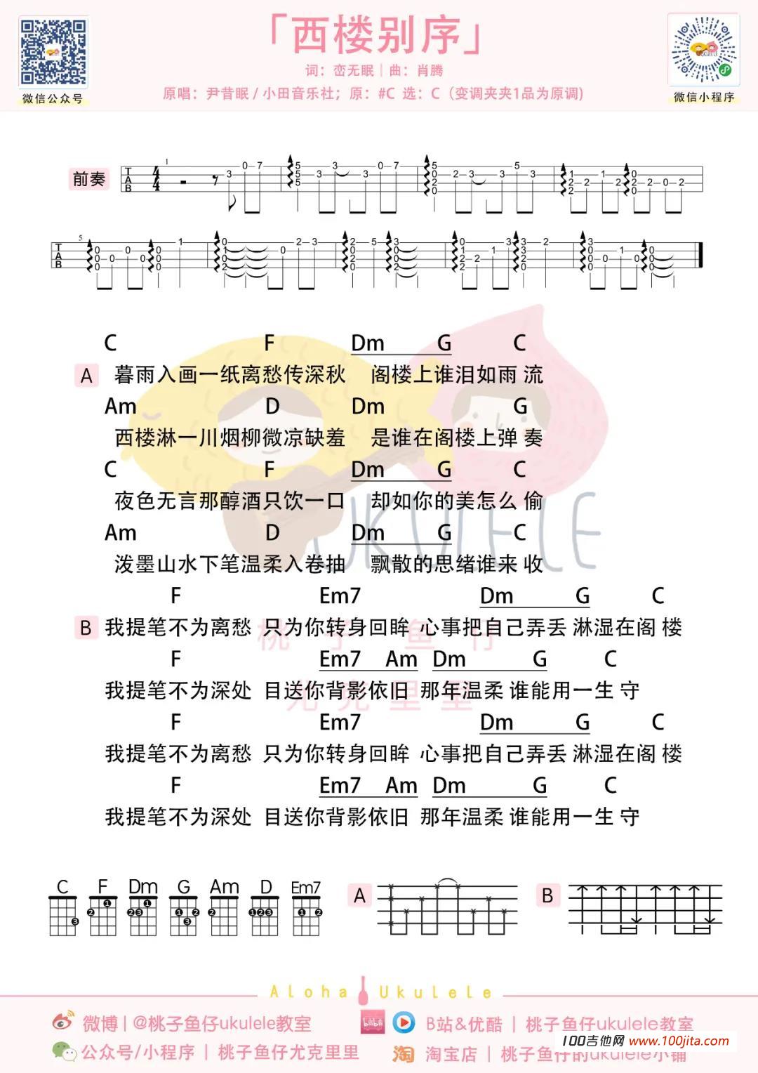 曲谱介绍: 《西楼别序》尤克里里谱是根据歌手尹昔眠的一曲歌编配的谱子。尹昔眠、小田音乐社单曲《西楼别序》歌曲是由峦无眠作词,肖腾作曲,Fsy小诺编曲。这首歌发行于2021年1月18日。歌曲充满了古风歌曲的韵味,让人听来有清雅淡伤的感觉。缠绵的曲风和懒懒的嗓音让歌曲极具感染力。西楼别难难在那斩不断的情丝和过往。喜欢这首歌曲的朋友弹唱一下哦。谱子采用C调编配。喜欢的朋友弹唱一下哦。