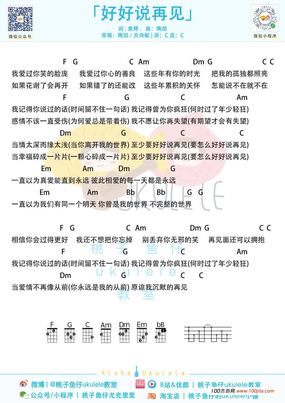 曲谱介绍: 《好好说再见》尤克里里谱是根据歌手陶喆的一首歌曲编配的谱子。喜欢陶喆过去的朋友记得弹奏一下这首尤克里里谱哦。琴谱网编辑整理。